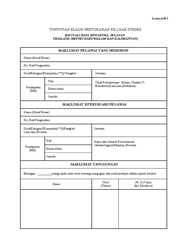 Use the download button below or simple. Pegawai yang diarahkan bertukar ke luar stesen layak menuntut Elaun Pertukaran yang terdiri daripada. TUNTUTAN ELAUN PERTUKARAN KE LUAR STESEN KECUALI BAGI SINGAPURA SELATAN THAILAND BRUNEI DARUSSALAM DAN KALIMANTAN MAKLUMAT PEGAWAI YANG.